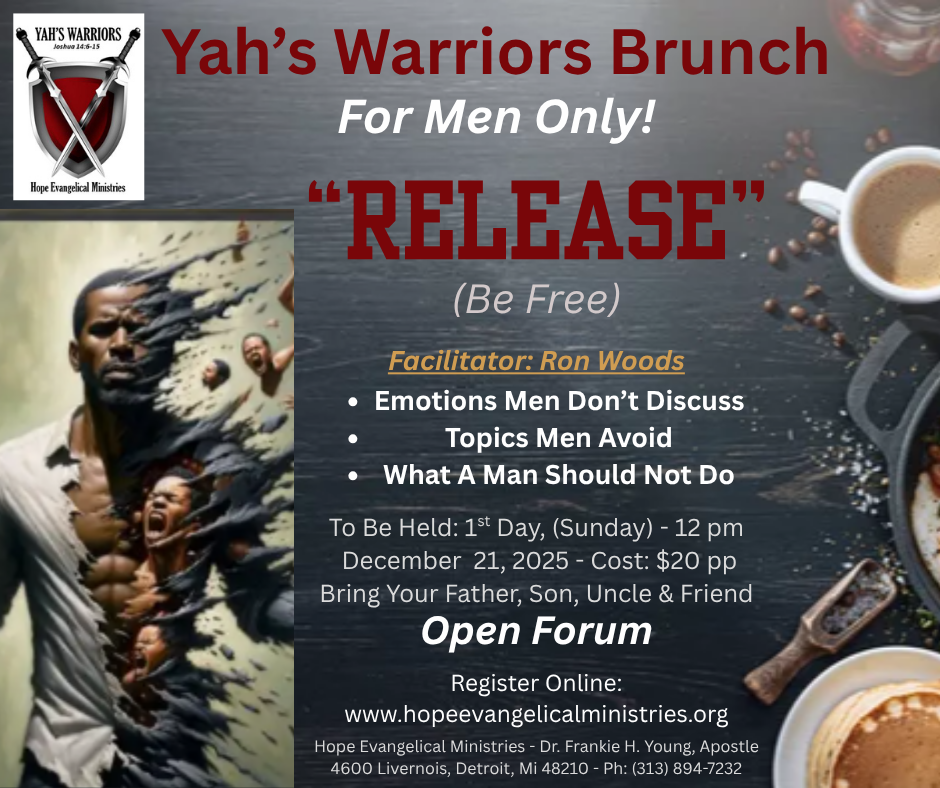 Yah’s Warrior’s, the Covenant Men of Hope Evangelical Ministries is hosting a men-ONLY brunch December 21st at 12:00 noon entitled “The Man Behind the Mask, covering all topics relevant to men. Bring your father, brother, cousins and friends, the young and old.